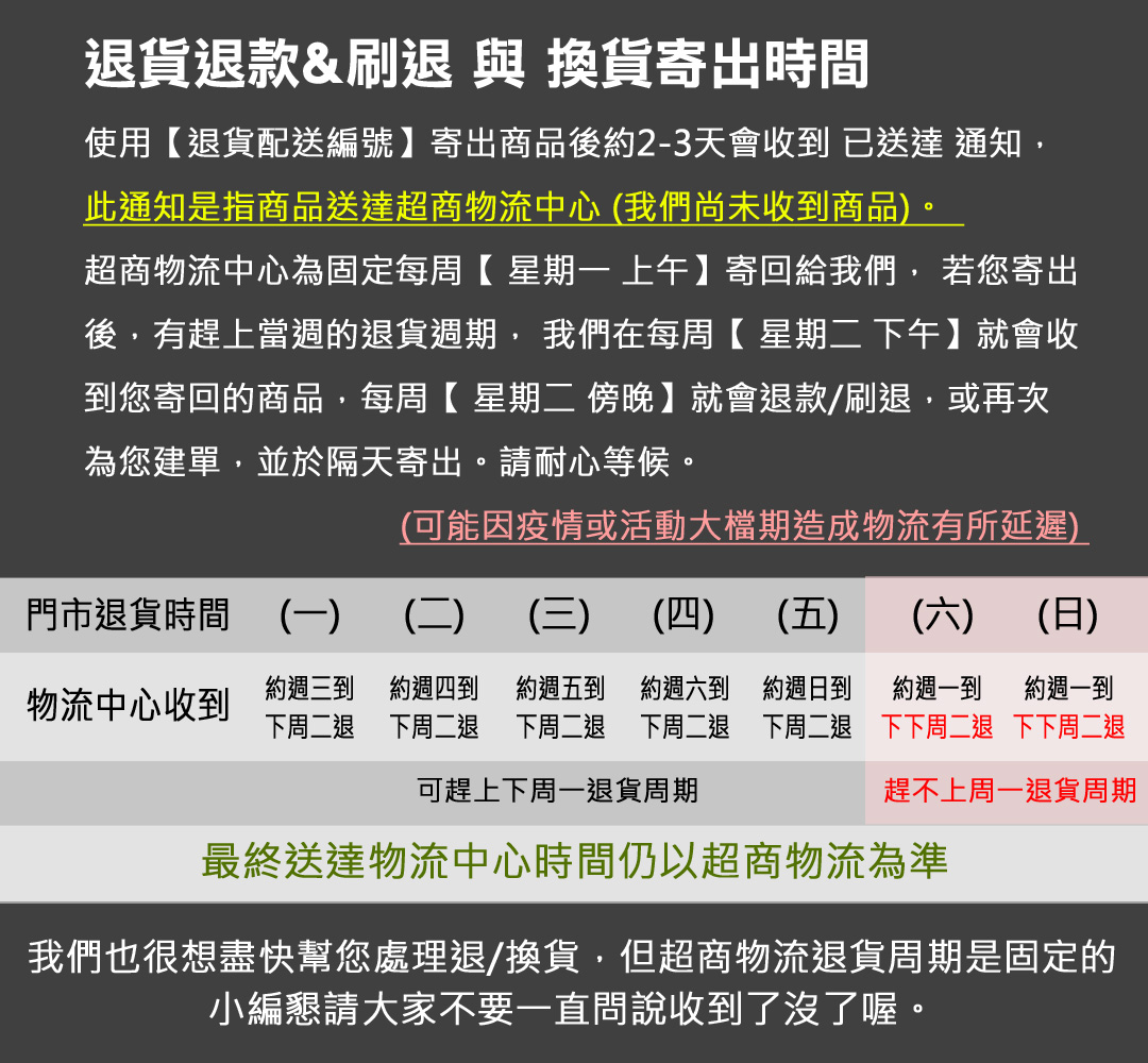 退貨退款&刷退 或 換貨時間說明